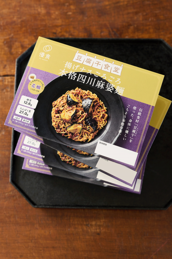 原材料名:大豆加工品(中国製造)、揚げ茄子、豚肉加工品、ねぎ、豆板醤、食用植物油脂、醤油、ラー油、アルロース(希少糖)、にんにくペースト、中華だし(食塩、食用油脂、チキンエキスパウダー、その他)、豆鼓醤、麻辣醤、香味食用油、添付小袋花椒(花椒)/糊料(加工澱粉、キサンタン)、酒精、豆腐用凝固剤、調味料(アミノ酸等)、pH調整剤、焼成Ca、酸化防止剤(V.E、V.C)、(一部に小麦・落花生・ごま・大豆・鶏肉・豚肉を含む)