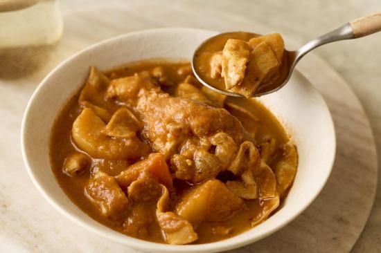 手羽元(国産)、大豆加工品(中国製造)(大豆(分別生産流通管理済))、野菜(にんじん、じゃがいも)、ソテーオニオン、トマトペースト、ガラスープ、食用菜種油、チキンコンソメ、カレー粉、おろしにんにく、砂糖、はちみつ、香辛料、おろししょうが、食塩/増粘剤(加工でんぷん)、凝固剤、調味料(アミノ酸等)、カラメル色素、酸味料、(一部に小麦、乳成分、大豆、鶏肉、豚肉、ゼラチンを含む)